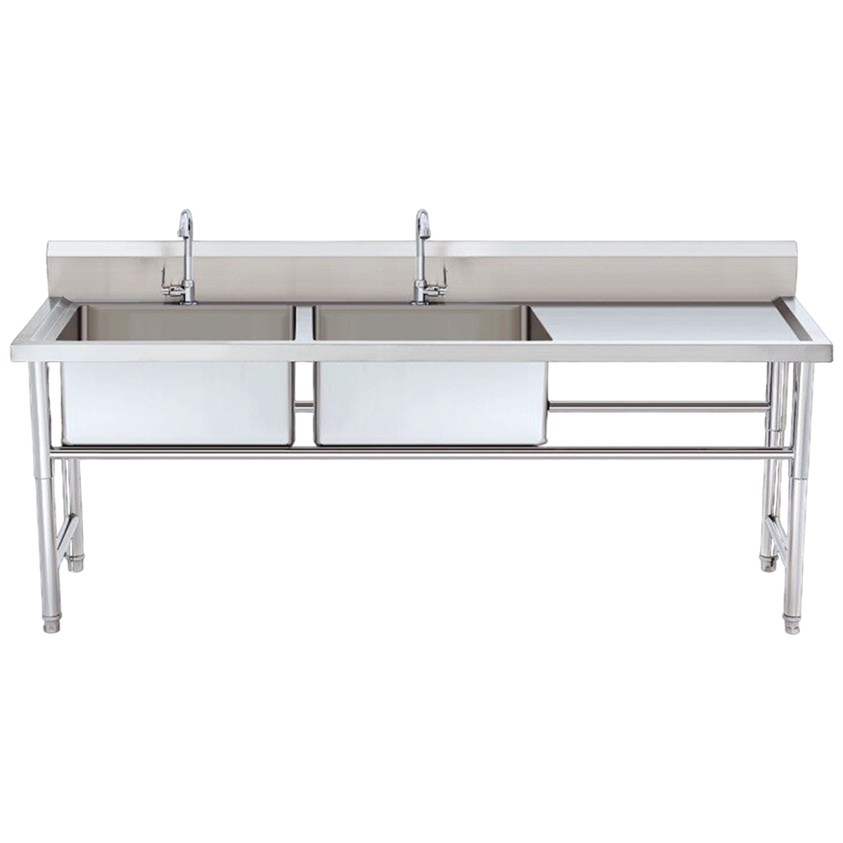 De doble fosa. Fabricado en acero SS201 7mm de grosor, de alta resistencia, con medidas de 1.75m de ancho x 60 cm de fondo x 80 cm de alto. Incluye 2 mezcladoras de agua, una de agua fria y una caliente, y otra mezcladora solo de agua fria, ademas de sus dos desagües y grifería completa, listo para instalar y usarse. Con patas de acero incluidas